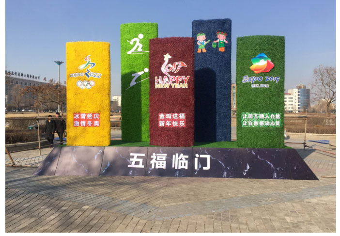 北京冬奧會(huì)干道主路口的五福臨門仿真植物綠雕