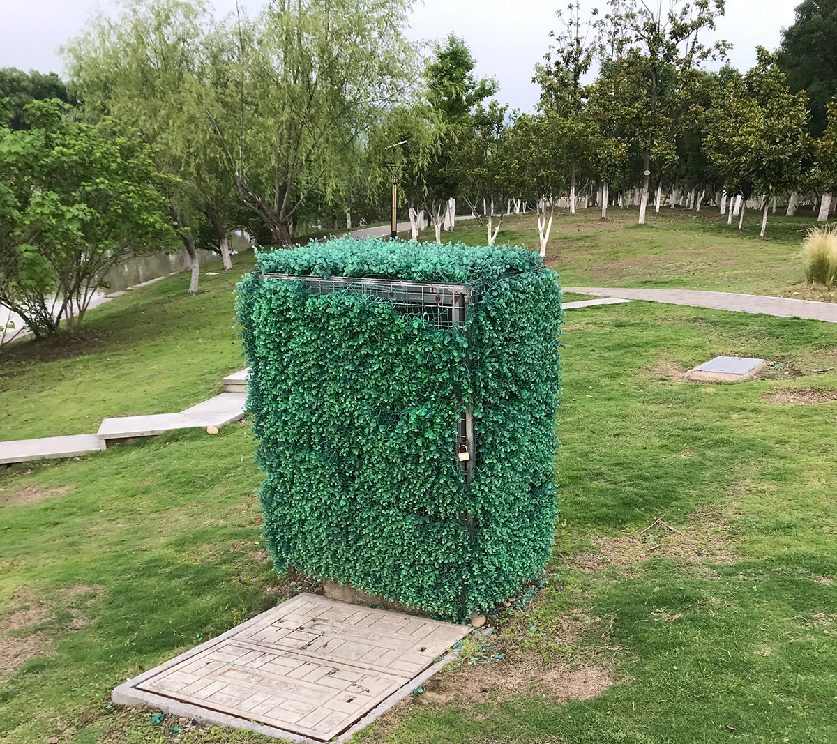 大型變電箱綠植裝飾,歷經(jīng)4年半,色彩沒有明顯變化,葉片也沒有明顯的掉落